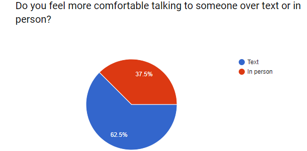 Due to the reason that communication through their phones is increasing, the comfort levels of talking to people in person is decreasing. This can be seen using data collected through an anonymous survey shown below.